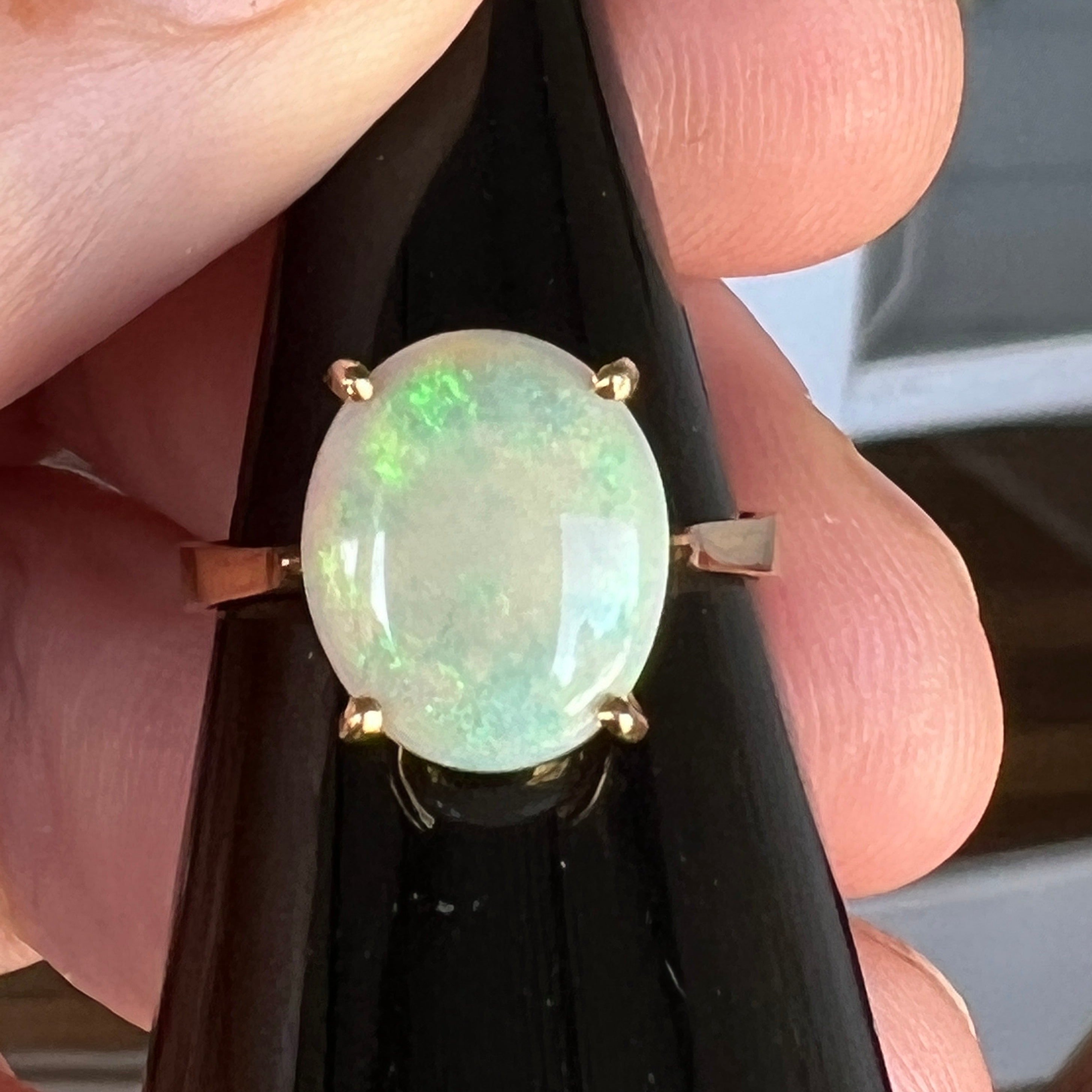 Stylish simple 14ct gold and opal ring. Great greens in this Coober Pedy crystal opal.